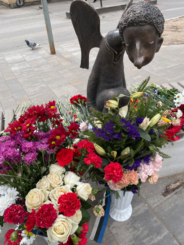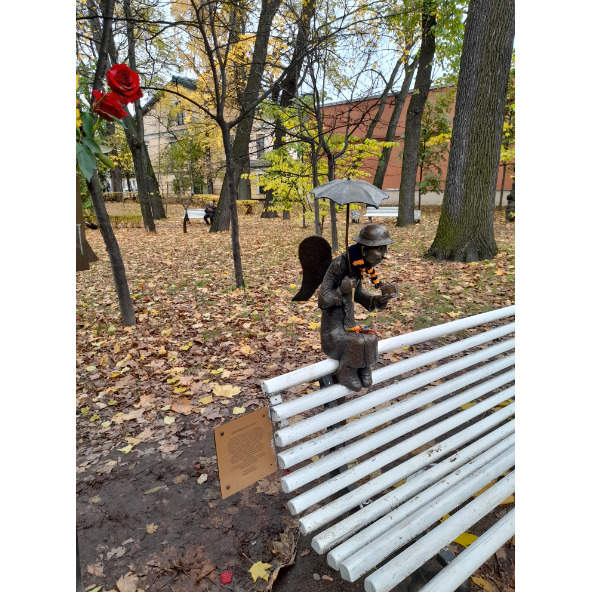 Это третий ангел города, сотворенный Шустровым. Его скульптуры теплые и человечные. Шустровский Печальный ангел сидит на скамеечке, грустно склонив голову, словно задумавшись о душах тех, кто погиб, сражаясь с коронавирусом.