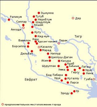 Помимо Урука надо назвать шумерские города Киш, Ур, Лагаш, Эреду, Ларса, Умма, Шуруппак, Иссин, Ниппур.