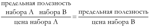 Правило потребительского поведения состоит в том, чтобы каждая последняя единица денежных затрат на приобретаемые блага приносила предельную добавочную полезность. Математическая формула, определяющая максимальную полезность (равновесную полезности), выглядит таким образом: