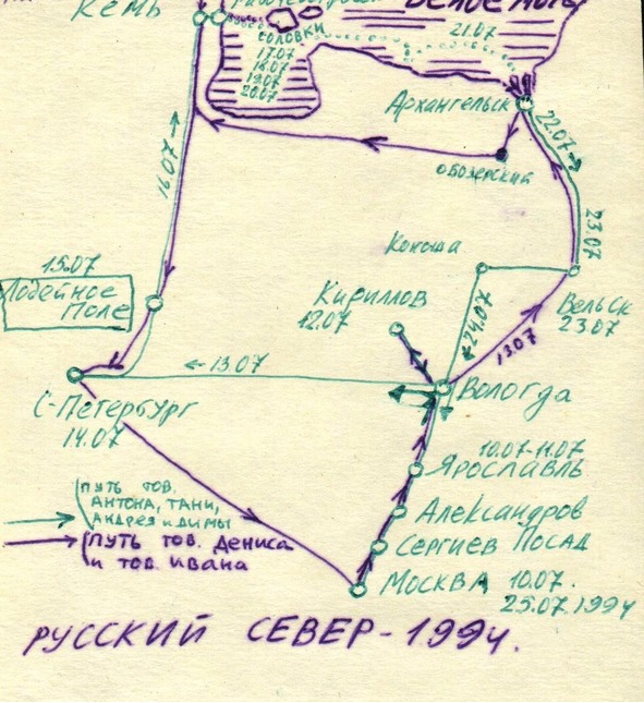 Когда мы зашли в Александрове в привокзальное кафе, там висела красивая тетрадь с надписью «Книга отзывов». Я взял её, но там не оказалось ни одного отзыва, и я, удивившись, написал: «Отзыв N 1. Отзываемся о сиём кафе положительно. – Антон, Денис, Дима, Таня, проездом на Русский Север 10.07.1994». Затем мы сели в электричку на Ярославль.