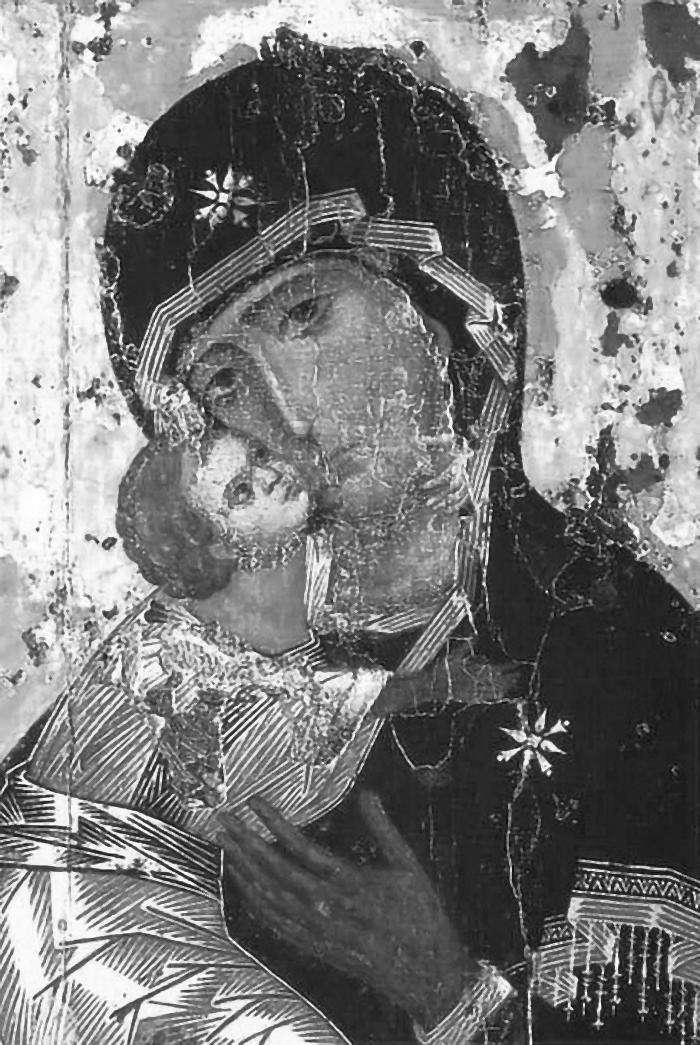 The Byzantine icon of the Virgin and Child known as the Vladimir Icon, painted c. 1131 CE in Constantinople. Restoration following fire damage means that only the faces are original. (Tretyakov Gallery, Moscow).
