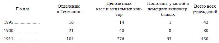В число 8-ми банков «первой степени зависимости», подчиненных «Немецкому банку» «от времени до времени», входит три заграничных банка: один австрийский (венский «Банковый союз» – «Bankverein») и два русских (Сибирский торговый и Русский банк для внешней торговли). Всего в группу «Немецкого банка» входит, прямо и косвенно, целиком и отчасти, 87 банков, а общая сумма капитала, своего и чужого, которым распоряжается группа, определяется в 2–3 миллиарда марок.