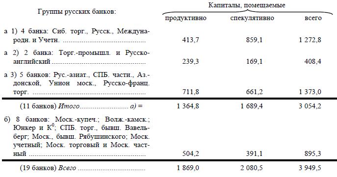 По этим данным, из почти 4-х миллиардов рублей, составляющих «работающий» капитал крупных банков, свыше 3/4, более 3-х миллиардов, приходится на долю банков, которые представляют из себя, в сущности, «общества-дочери» заграничных банков, в первую голову парижских (знаменитое банковое трио: «Парижский союз»; «Парижский и Нидерландский»; «Генеральное общество») и берлинских (особенно «Немецкий» и «Учетное общество»). Два крупнейших русских банка, «Русский» («Русский банк для внешней торговли») и «Международный» («СПБ. Международный торговый банк») повысили свои капиталы с 1906 по 1912 год с 44 до 98 млн. руб., а резервы с 15 до 39 млн., «работая на 3/4 немецкими капиталами»; первый банк принадлежит к «концерну» берлинского «Немецкого банка», второй – берлинского «Учетного общества». Добрый Агад глубоко возмущается тем, что берлинские банки имеют в своих руках большинство акций и что поэтому русские акционеры бессильны. И разумеется, страна, вывозящая капитал, снимает сливки: например, берлинский «Немецкий банк», вводя в Берлине акции Сибирского торгового банка, продержал их год у себя в портфеле, а затем продал по курсу 193 за 100, т. е. почти вдвое, «заработав» около 6 млн. рублей барыша, который Гильфердинг назвал «учредительским барышом».