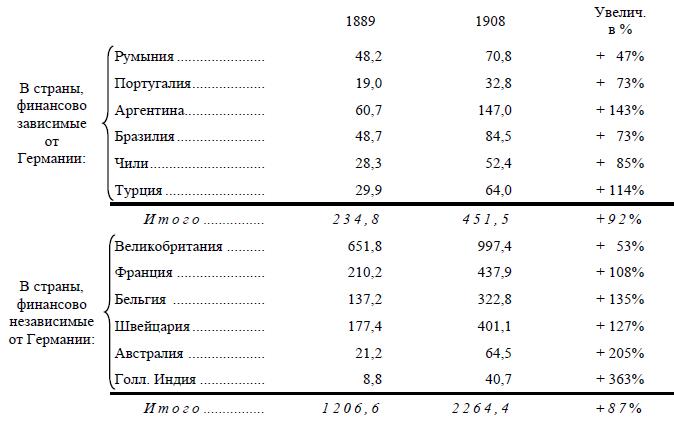 Интересно, что даже буржуазный экономист А. Лансбург, критикующий империализм так же мещански, как Каутский, подошел все же к более научной обработке данных торговой статистики. Он взял сравнение не одной случайно выхваченной страны и только колонии с остальными странами, а сравнение вывоза из империалистской страны 1) в страны финансово зависимые от нее, занимающие у нее деньги и 2) в страны финансово независимые. Получилось следующее:
