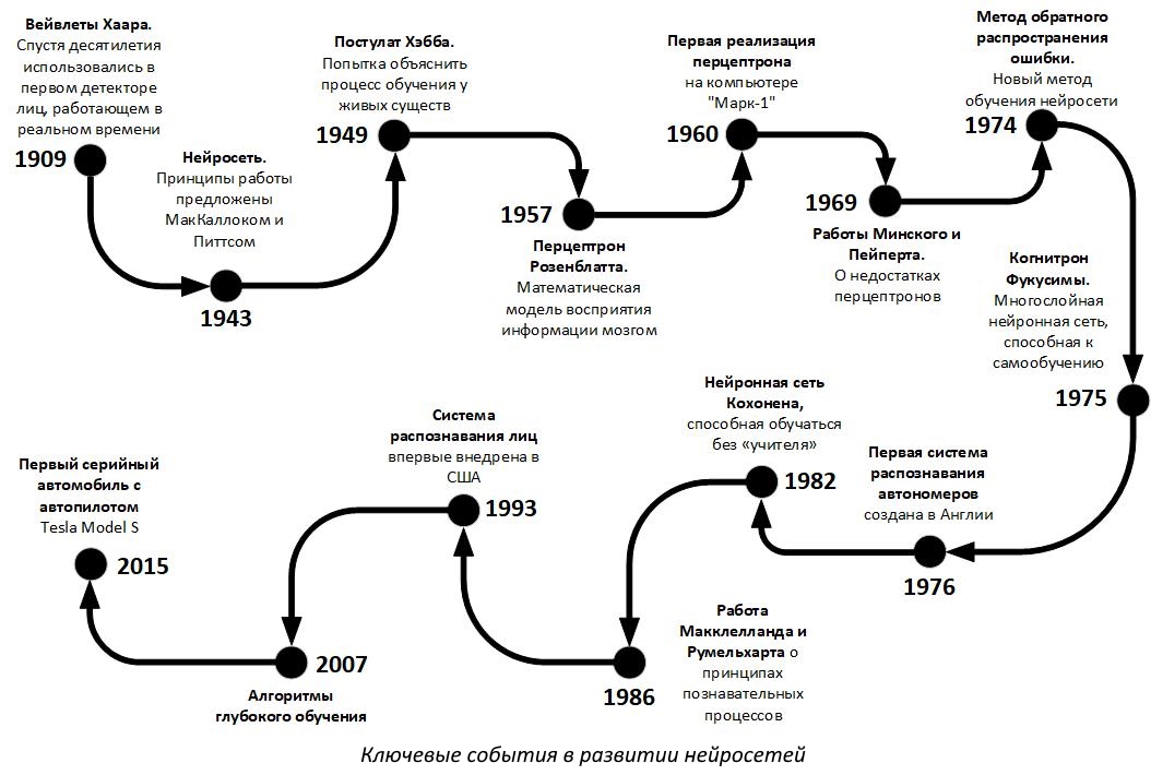 Но это не значит, что нейросети сидели и ждали появления быстрых компов, ничего не делая. На следующем рисунке показаны важные события в истории развития нейросетей.