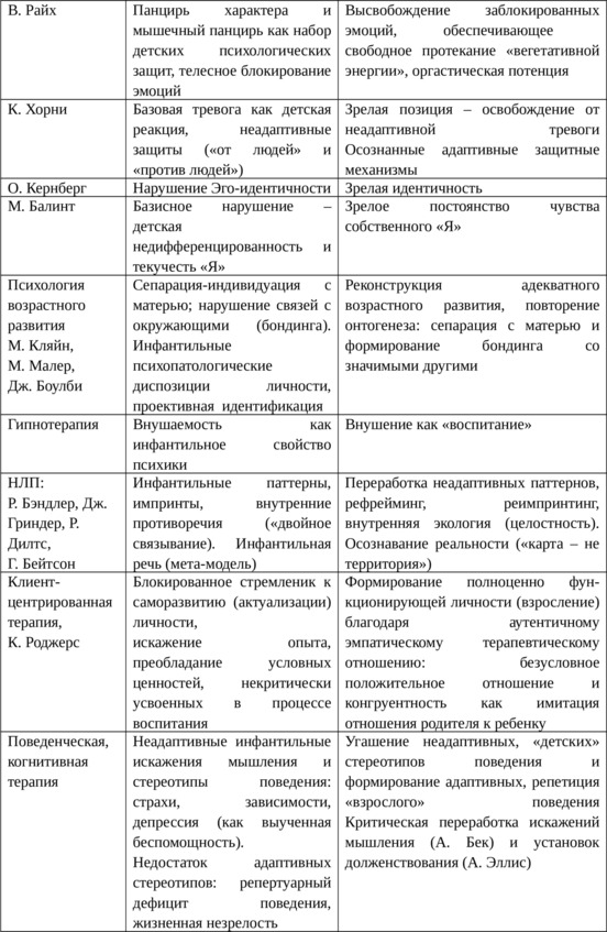 Нетрудно видеть, что в качестве причин возникновения психологических проблем и механизмов их формирования все перечисленные классические методы психотерапии указывают инфантильность, но рассматривают ее фрагментарно, в отдельных проявлениях. Среди последних инфантильные механизмы мышления (когнитивная психотерапия) и речи (НЛП), поведения (поведенческая психотерапия), психологических защит (психоанализ), отношения к себе и окружающим (гештальт, трансактный анализ, клиент-центрированная терапия), к жизни в целом (в экзистенциальном аспекте).