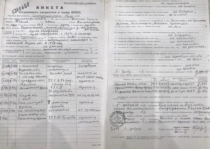 Анкета вступающего кандидатом в члены ВКП(б) Ивана Дмитриевича Павлова от 6 февраля 1943 г.