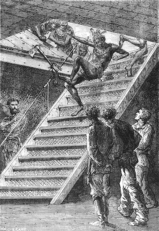 Я пошел за ним к центральному трапу, где Нед Ленд и Консейль с любопытством наблюдали, как несколько матросов открывали люк. Сверху между тем раздавались яростные крики и вопли.