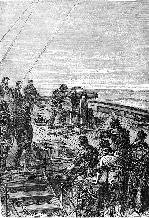– А! – сказал он. – Это животное идет быстрее «Авраама Линкольна». Ну, делать нечего! Теперь посмотрим, как оно будет уходить от конических ядер! – И капитан крикнул: – Зарядить носовую пушку!