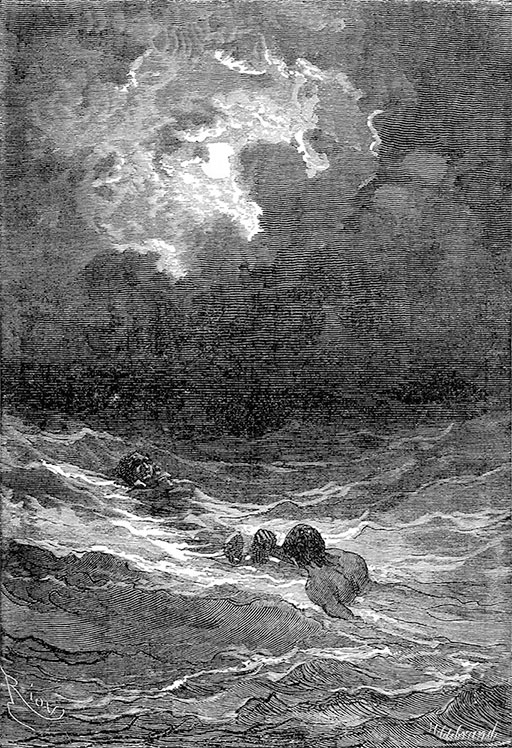 В эту самую минуту месяц выглянул из-за туч, и поверхность океана засверкала под его лучами. Этот благодетельный свет как будто придал нам сил. Я поднял голову и огляделся.