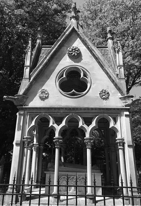 На Пер-Лашез встречаются захоронения и в египетском стиле, особенно в виде пирамид (семейные мавзолеи) и обелисков. Знаток древностей и сторонник классицизма, французский теоретик искусства Антуан Катрмер де Кенси (1755–1859) считал египетское и древнегреческое искусство архитектурным «праязыком», а готическую архитектуру – одной из его «разновидностей»[74]. Он активно участвовал в становлении Пер-Лашез, и еще в 1788 году написал статью для Encyclopedie metodique о запланированных садово-парковых кладбищах. Его классификация надгробных памятников сыграла важную роль в ранний период развития и неоклассического, и неоготического архитектурных кладбищенских стилей[75]. Если для Кенси главным было искусственно созданное, то предромантизм и романтизм восславляли природу.