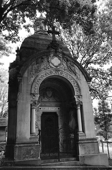 Вскоре на парижских садово-парковых кладбищах стали встречаться семейные усыпальницы в виде неоготического склепа с арками, стрельчатыми и орнаментальными шпилями[62] (ил. 3), основным прототипом которых служил, разумеется, готический собор. Обращение к архитектуре предшествующих эпох усиливает роль исторической памяти в культурном пространстве. Стандартными надгробиями были капеллы, и не только неоготические[63], но и византийские с полукруглым куполом (ил. 4)[64].