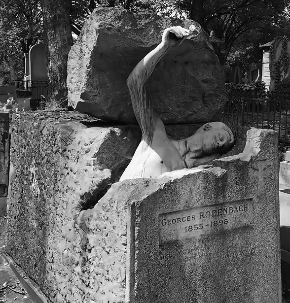 Надгробие Роденбаха (около 1898) в стиле модерн изображает писателя, который восстает из взломанного гроба и при этом в вытянутой вверх руке держит розу, как бы предлагая ее посетителю. Стремление прочь из могилы вполне соответствует эмоциям, связанным с относительно ранней смертью Роденбаха[80] (ему было лишь 43 года). В бронзовой скульптуре Шарлотты Бенар (Дюбрей) он похож на себя – портретный стиль надгробий возник в середине XIX столетия.