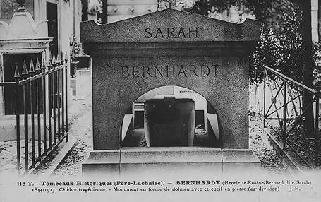 Разумеется, на Пер-Лашез похоронены государственные деятели, военные чины и революционеры, ученые, издатели и журналисты, финансисты и математики, социологи и историки, философы, адвокаты, авиаторы, актеры, певцы и многие другие. Из известных ученых-социологов там покоится Огюст Конт, родоначальник позитивизма; из философов – Вениамин Констант и постструктуралист Ж.-Ф. Лиотар; из авиаторов – Хорхе Чавес[90] (1887–1910; из актеров – Ф.-Ж. Тальма (начало XIX в.), знаменитая актриса эпохи fin de siècle Сара Бернар, надгробие которой (здесь мы видим его на старой открытке) напоминает бункер (ил. 13), Ив Монтан и Симона Синьоре (вторая половина ХХ в.); из певиц – Эдит Пиаф (ее семейная могила – одна из самых посещаемых на Пер-Лашез).