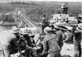 Танк Pz.II и 20-мм зенитка на прикрытии моста у Алитуса.