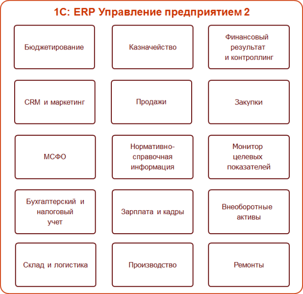 Схема подсистем 1C: ERP представлена ниже на рисунке.