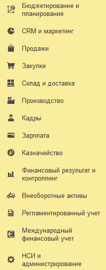 Подсистемы на схеме соответствуют разделам или подразделам внутри интерфейса системы и доступны при включении соответствующих опций. В процессе подготовки к внедрению определяется перечень внедряемых блоков – можно использовать только некоторые нужные блоки, а остальные подключать по мере готовности компании к их использованию.