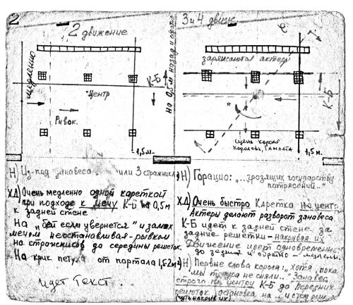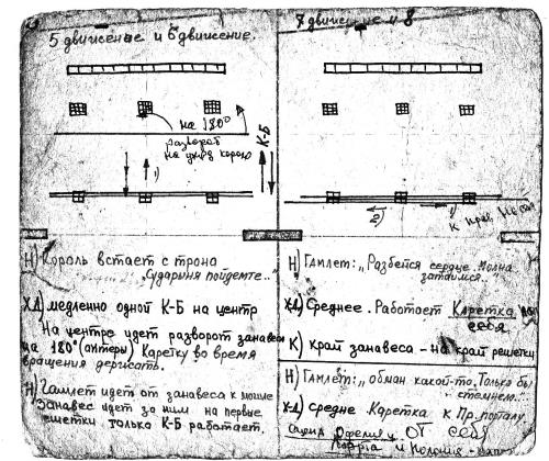 Занавес проткнут мечами. Клинки, протыкающие занавес и угрожающе выдвинутые остриями вперед, служат подлокотниками трона. Король садится справа, Королева – слева. Гроб, выдвинутый из-под занавеса, служит троном. Гамлет стоит один слева у края гроба, сбоку, у самого портала.