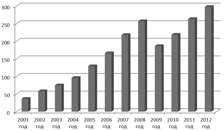 Рис. 4. Динамика развития медиарекламного рынка России в 2001–2012 гг. (млрд руб., без учета НДС)