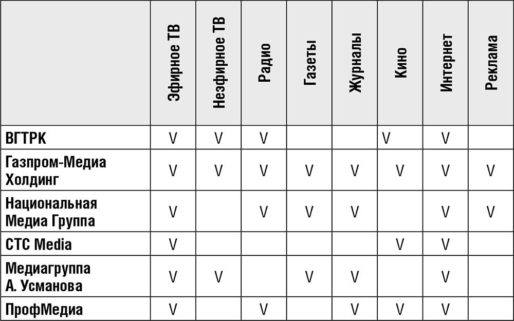 Между тем, бурное развитие отрасли не привело к сокращению удельного веса на медиарынке России финансово-промышленных групп. Претерпел изменение состав ФПГ, владеющих медиаактивами. Еще в 2001 г. СМИ, входящие в холдинг «Медиа-Мост» В. Гусинского, полностью перешли под контроль холдинга «Газпром-Медиа» в счет погашения кредиторской задолженности, а части медиагруппы Б. Березовского за 2001–2006 гг. по разным причинам рассредоточились между другими собственниками. Холдинг «ПрофМедиа» В. Потанина сохранился и, напротив, расширил свои позиции в отрасли. Кроме того, с 2005 г. началось формирование нового диверсифицированного холдинга «Национальная Медиа Группа» Ю. Ковальчука (АБ «Россия»[48]), а с 2006 г. – медиагруппы А. Усманова («USM Holdings»[49]).
