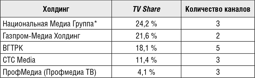 Таблица 4. ТОР-5 телевизионных холдингов России по суммарной аудитории эфирных каналов в 2012 г.[60]