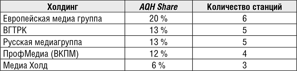 Таблица 5. ТОР-5 радиохолдингов России по суммарной аудитории станций в 2012 г.