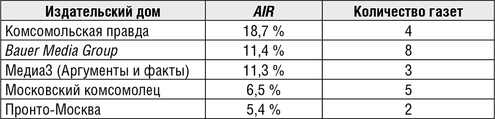 Прямая зависимость медиаиндустрии от динамики развития рекламного рынка неизбежна. А ухудшение общей ситуации в отрасли, равно как и ее улучшение, может повлечь за собой очередной виток концентрации СМИ – консолидацию слабых игроков под эгидой наиболее сильных, укрепление олигополистической структуры в рамках сегментов рынка, в каждом из которых сложился свой очевидный «рейтинг лидеров», по крайней мере, по медиаметрическим показателям (см. Табл. 4, 5, 6, 7). В целом же на данный момент принято считать, что ведущие позиции на медиарынке России занимает следующая «большая шестерка»:
