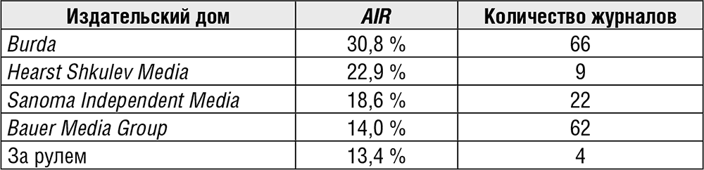 Таблица 7. ТОР-5 издательских домов России по суммарной аудитории журналов в 2012 г.