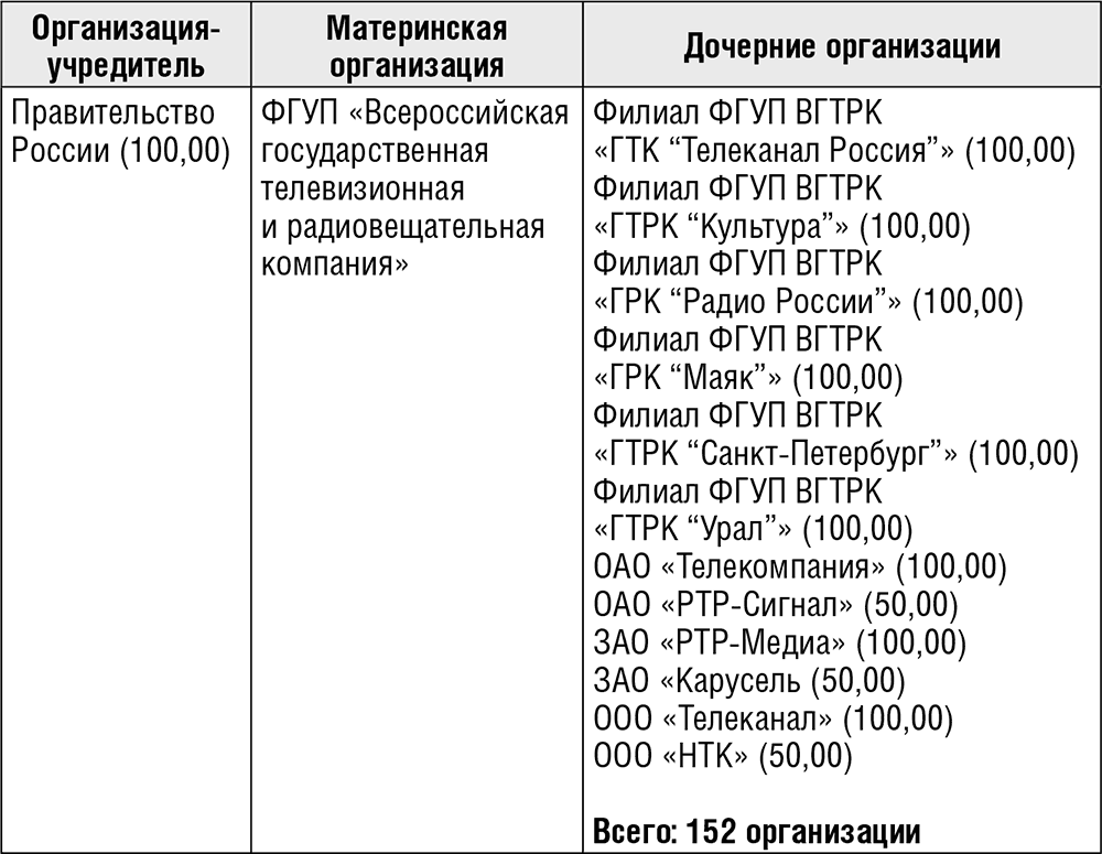 ФГУП «Всероссийская государственная телевизионная и радиовещательная компания» (ВГТРК) имеет наиболее понятную и прозрачную организацию структуры собственности. ВГТРК на 100 % является собственностью Правительства России. При этом само ФГУП является учредителем/соучредителем 148 филиалов и иных юридических лиц (в т. ч. хозяйственных обществ), обеспечивающих деятельность различных эшелонов ВГТРК – федеральных телеканалов и радиостанций, а также региональных ГТРК и пр. Юридический нюанс заключается в том, что учредителем всех основных СМИ выступает сама материнская организация, а не ее филиалы, что, однако, не отменяет наличия у ВГТРК большой «семьи» дочерних предприятий (см. Табл. 8). Таким образом, в случае с ВГТРК можно говорить о смешанном классическом имущественном холдинге, с той оговоркой, что речь здесь, как правило, не идет об акционерном капитале.