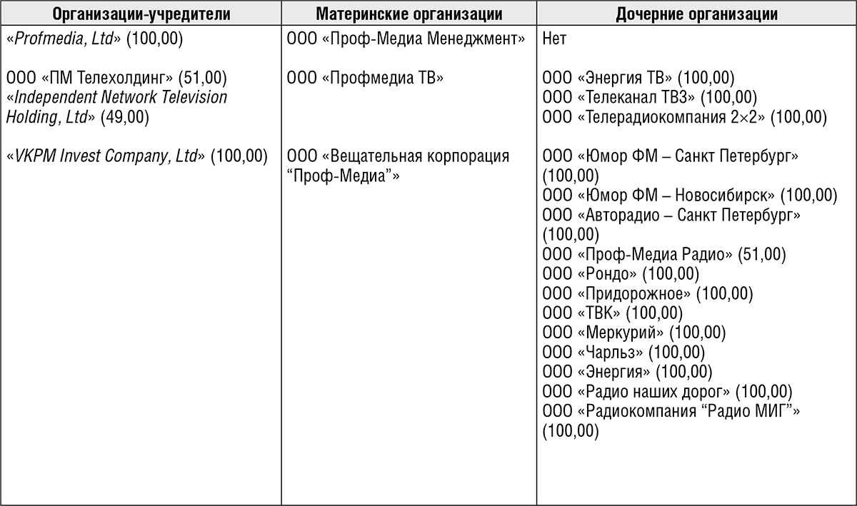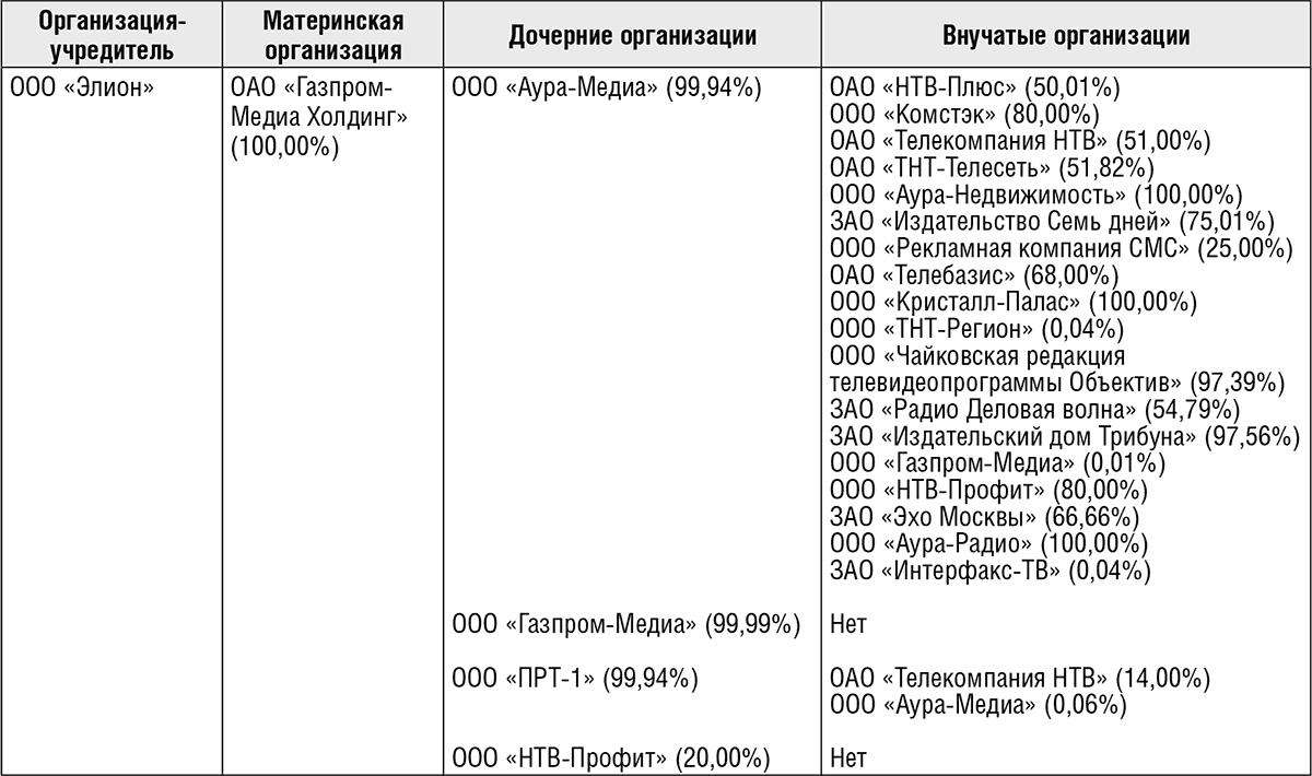 ОАО «Газпром-Медиа Холдинг» формально является собственностью некоего ООО «Элион». Эта организация через еще две промежуточные фирмы имеет бенефициара в лице ОАО «Газпромбанк», которое, свою очередь, на 35,54 % принадлежит ОАО «Газпром». Сам ГМХ напрямую является учредителем только четырех предприятий – ООО «Аура-Медиа», ООО «Газпром-Медиа», ООО «ПРТ-1» и ООО «НТВ-Профит» (см. Табл. 9). У двух дочерних организаций имеются свои дочерние организации, и именно ООО «Аура-Медиа» является непосредственным владельцем всех ключевых медиаактивов холдинга – контрольных пакетов акций ОАО «Телекомпания НТВ», ОАО «ТНТ-Телесеть», ЗАО «Эхо Москвы», ОАО «НТВ-Плюс», ЗАО «Издательство “Семь дней”», ЗАО «Издательский дом “Трибуна”» и др. Таким образом, можно сделать вывод, что ключевой организацией в этой сложной структуре является, скорее, не сам ГМХ, а малоизвестное предприятие «Аура-Медиа». По сути, речь идет о субхолдинге в виде дополнительной управляющей организации, смысл существования которой не вполне ясен. Функции субхолдинга выполняет также «ПРТ-1», являющееся миноритарным акционером «Телекомпании НТВ». Но все же ГМХ можно идентифицировать как чистый классический имущественный холдинг.