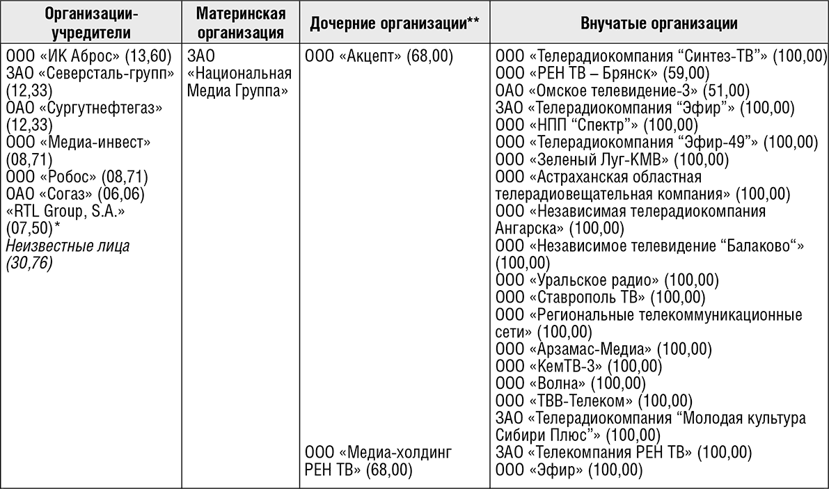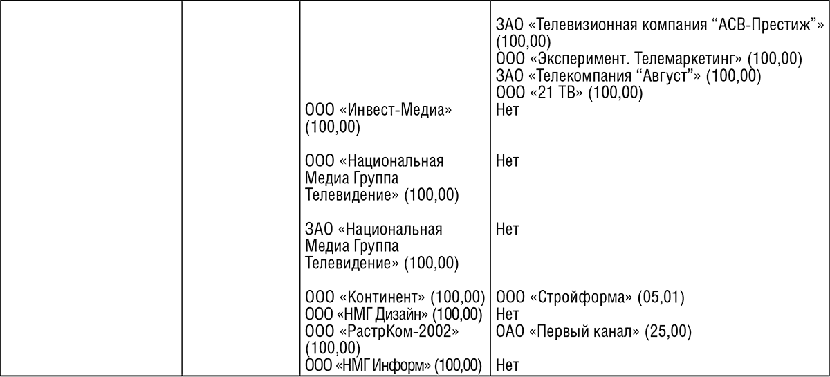 Структура собственности ЗАО «Национальная Медиа Группа» выглядит гораздо сложнее. Состав учредителей материнской организации не свидетельствует о ключевом участии в ней структур ОАО «АБ “Россия”» – ООО «ИК “Аброс”» владеет лишь 13,60 % акций. Кроме того, перечень дочерних организаций НМГ довольно сложен для прямой идентификации контролируемых им медиаактивов (см. Табл. 10). Формально НМГ является непосредственным владельцем ООО «Медиа-холдинг РЕН ТВ» (в его собственности на 100 % находится ЗАО «Телекомпания РЕН ТВ») и ООО «Континент» (радиостанция РСН). Контроль над 25,00 % акций ОАО «Первый канал» осуществляется через ООО «РастрКом-2002». Роль крупного субхолдинга играет также ООО «Акцепт». При этом НМГ формально не является собственником ОАО «Телерадиокомпания “Петербург”» – ею, прежде всего, через ИК «Аброс» (22,43 %) все же владеет сам АБ «Россия»[74]. Подобная ситуация, как будет указано ниже, не является исключительной для организации медиабизнеса Ю. Ковальчука. Кроме того, ЕГРЮЛ не фиксирует контроль дочерних структур АБ «Россия» в ЗАО «Группа компаний «Видео Интернешнл», не устанавливается их формальная связь и с ОАО «Ньюс Медиа». Тем не менее сама НМГ имеет черты чистого классического имущественного холдинга.