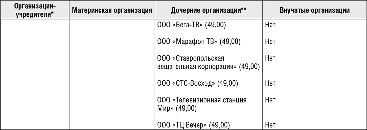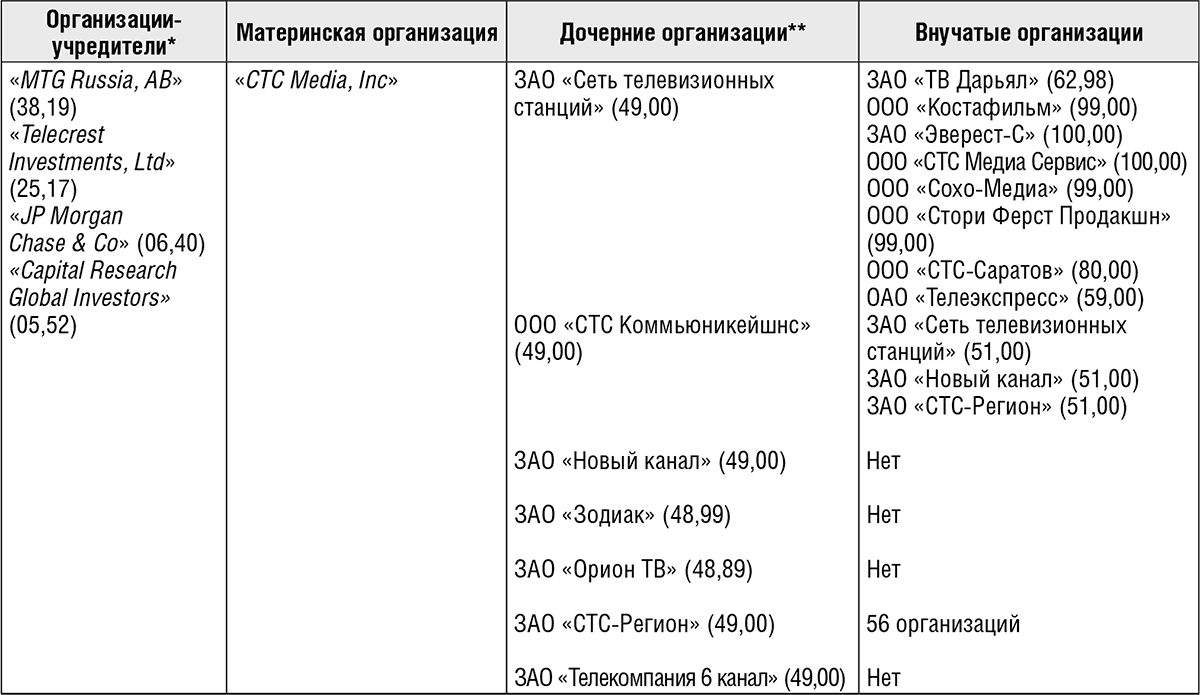 Помимо доли в НМГ, АБ «Россия» через ООО «Медиасет» и «Telecrest Investments, Ltd» является держателем 25,17 % «СТС Media, Inc». Эта управляющая организация, не будучи российским юридическим лицом (Incorporated зарегистрирована в США), не имеет и среди учредителей ни одного российского резидента. Самый большой пакет акций СТСМ принадлежит «MTG Russia, AB» (Швеция). Холдинг является публичным – в обращении на бирже находятся 24,72 % акций. Материнская организация является соучредителем 19 российских предприятий, среди которых, в частности, ЗАО «Сеть телевизионных станций» (телеканал СТС) и ЗАО «Новый канал» (телеканал «Домашний»). Особенность структуры собственности СТСМ заключается в том, что она не выступает в качестве держателя контрольного пакета акций в предприятиях, осуществляющих в России эфирное телевизионное вещание (см. Табл. 11). Но опосредованный контроль установлен через другую дочернюю организацию – резидента РФ ООО «СТС Коммьюникейшнс». Именно этот субхолдинг является мажоритарным акционером «Сети телевизионных станций» и «Нового канала». Играя роль еще одного субхолдинга СТСМ, «Сеть телевизионных станций», в свою очередь, также имеет ряд дочерних предприятий. В их числе, например, находится ЗАО «ТВ Дарьял» (телеканал «Перец»), а также ООО «Стори Ферст Продакшн». СТСМ очевидно представляет собой чистый классический имущественный холдинг.