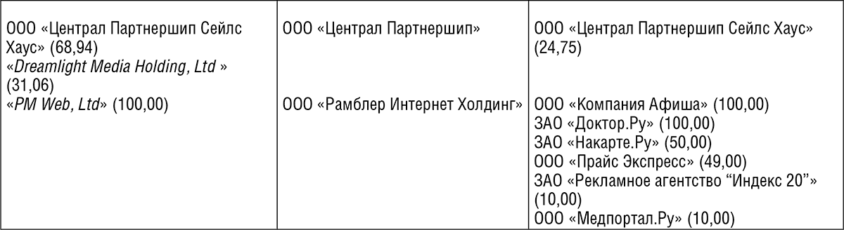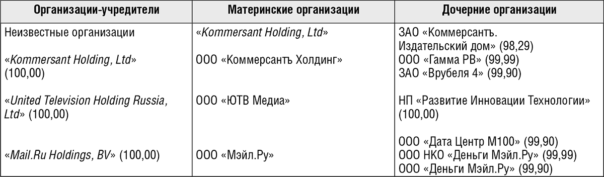 Отдельный интерес, безусловно, представляют медиахолдинги, присутствующие на биржевых площадках. По состоянию на 2012 г. к ним, помимо «СТС Media» и «Мэйл. Ру», также относились РБК и «Яндекс». В обоих случаях контрольные доли в российских управляющих организациях принадлежат зарубежным юридическим лицам, а уже российские резиденты выступают учредителями ряда других предприятий. Но, безусловно, налицо два чистых классических имущественных холдинга (см. Табл. 14, 15). Что же касается крупнейших игроков отдельных сегментов медиаиндустрии (лидеров ТОР-5 по аудитории), то в части структуры собственности они не демонстрируют особо сложных схем. Правда, среди учредителей управляющих организаций здесь встречаются и физические лица, что вряд ли было бы возможно в «большой шестерке». По своему внутреннему устройству ИД «Комсомольская правда», ИД «Burda» и «Европейская медиа группа» тоже являются чистыми классическими имущественными холдингами (см. Табл. 16, 17, 18).