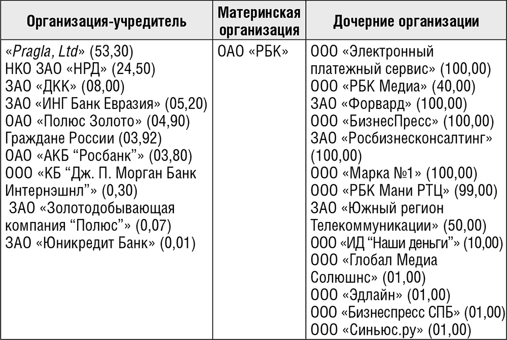 Таблица 14. Структура собственности РБК (ЕГРЮЛ, 2012 г.)