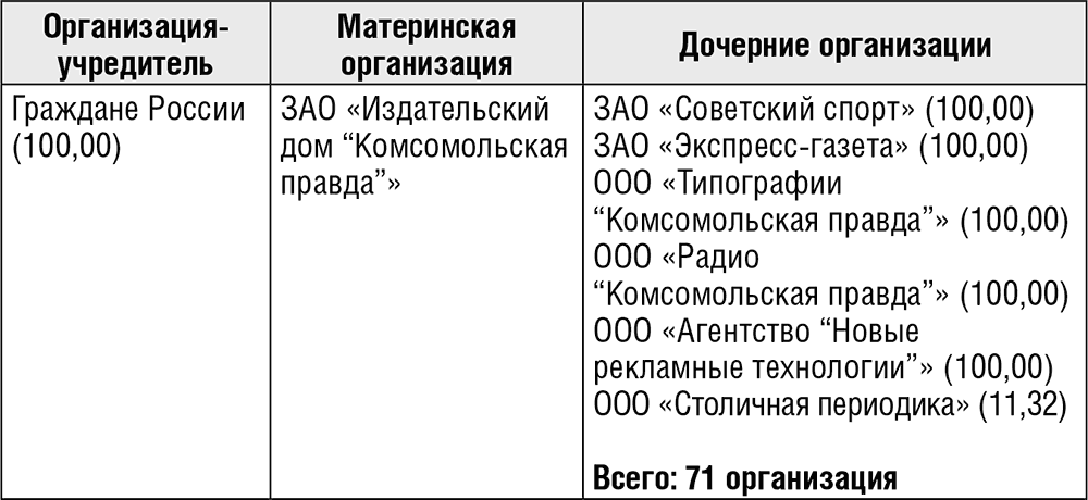 Таблица 16. Структура собственности ИД «Комсомольская правда» (ЕГРЮЛ, 2012 г.)