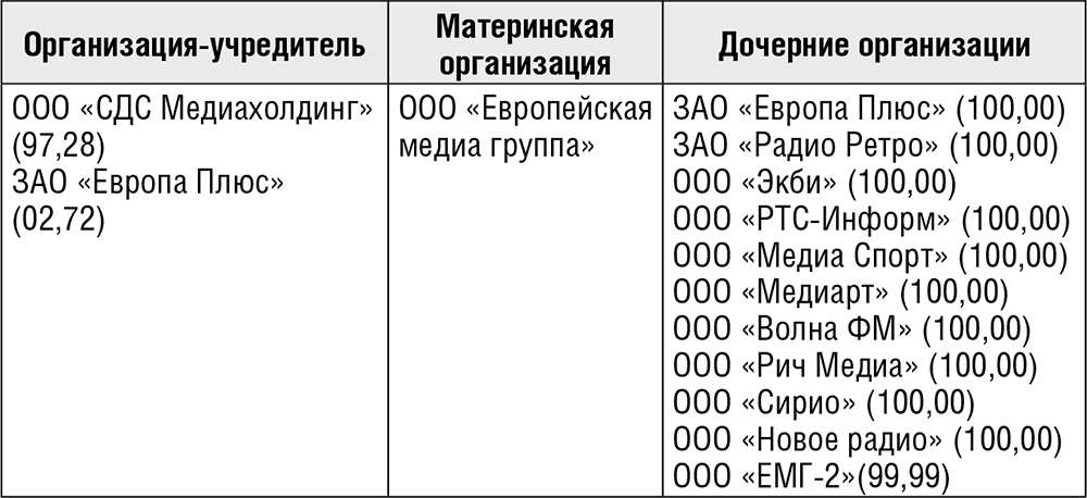Таблица 18. Структура собственности «Европейской медиа группы» (ЕГРЮЛ, 2012 г.)