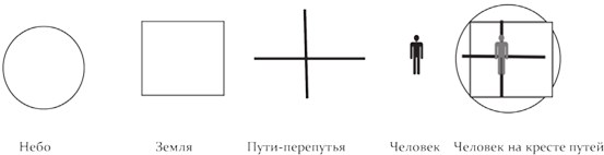 Геометрия хронотопа такова: небо представлено кругом, земля квадратом, крест-путь стягивает небо и землю, запад и восток, верх и низ, сочленяя и удерживая все пределы в космическое целое, символом которого выступает Мировое Древо (см. подр. [Топоров 2010]) (рис.).