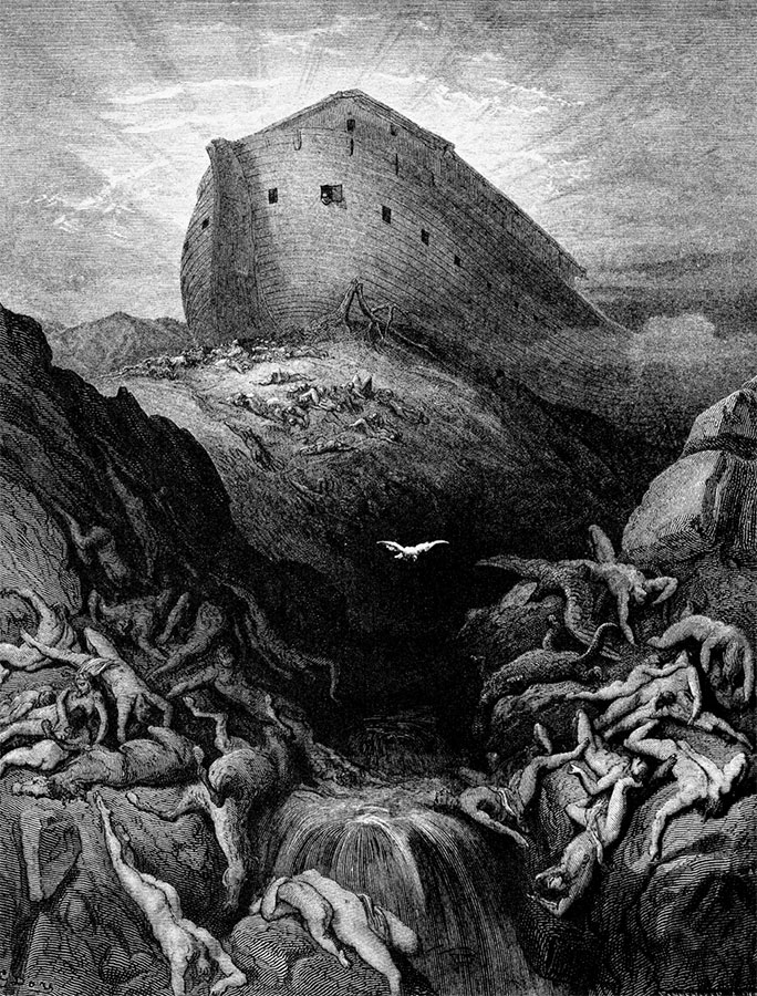 Так совершилось великое наказание Божие развращенному и утопавшему во зле человечеству. Вода быстро затопляла все и поднималась все выше и выше, на пятнадцать локтей покрывая даже высочайшие горы. «И лишилась жизни всякая плоть, движущаяся по земле, и птицы, и скоты, и звери, и все гады, ползающие по земле, и все люди. Все, что имело дыхание духа жизни в ноздрях своих на суше, умерло. Истребилось всякое существо, которое было на поверхности [всей] земли; остался только Ной, и что было с ним в ковчеге». Вода же прибывала в течение полутораста дней, или пяти месяцев. Вся поверхность земли покрылась водой, и по этому необъятному морю носился только один ковчег Ноев, заключавший в себе лишь избранное семя для развития новой жизни на земле. «И вспомнил Бог о Ное и о всех бывших с ним в ковчеге, и навел Бог ветры на землю, и воды остановились». Источники бездны закрылись, дождь прекратился, и вода пошла на убыль. Ровно через пять месяцев с начала потопа ковчег остановился на горах Араратских. В первый день десятого месяца показались верхи гор, а еще по прошествии сорока дней Ной уже открыл окно в ковчеге и выпустил первого вестника ворона, который, однако же, вылетев и найдя, видимо, обильную для себя пищу в трупах на вершине обнажившихся гор, не дал ясного извещения о состоянии земли, а неопределенно «отлетал и прилетал, пока осушилась земля от воды». Выпущенный затем голубь, не найдя сухого места, возвратился в ковчег, но, выпущенный опять через семь дней, он возвратился со свежим масличным листом во рту, и Ной таким образом «узнал, что вода сошла с земли». Выпущенный еще через семь дней, голубь уже не возвратился. Тогда Ной открыл кровлю ковчега и увидел, что поверхность земли обсохла, а к двадцать седьмому дню второго месяца шестисот первого года жизни Ноя, т. е. ровно через год со времени наступления потопа, и совсем высохла.