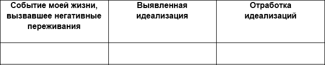 Вторая колонка: «Выявленная идеализация». Сюда вы будете записывать, какие ваши идеализации «воспитывает» жизнь этим эпизодом. Поскольку за любым переживанием стоит значимая для вас идея о том, каким должен быть этот мир (или конкретный человек), а мир с вашими ожиданиями не совпал, то вы запишете туда свои ожидания.