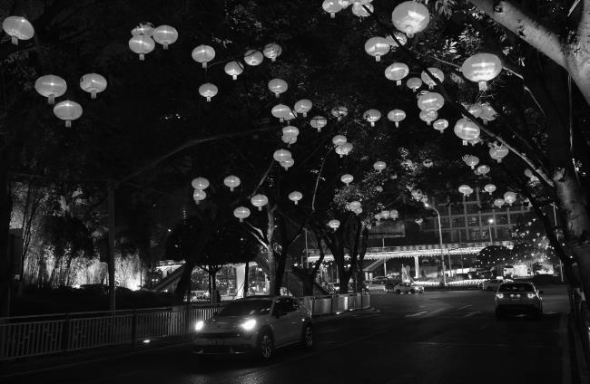 Улица в Чунцине, увешанная красными фонариками, во время празднования китайского Нового года