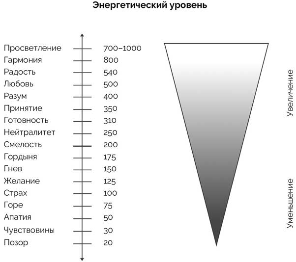 Эта шкала показывает спектр возможных вибраций, то есть состояний человека. Чувства из нижней части графика дают меньше всего энергии. Поэтому, если мы часто испытываем стыд и вину, у нас нет сил на движение.