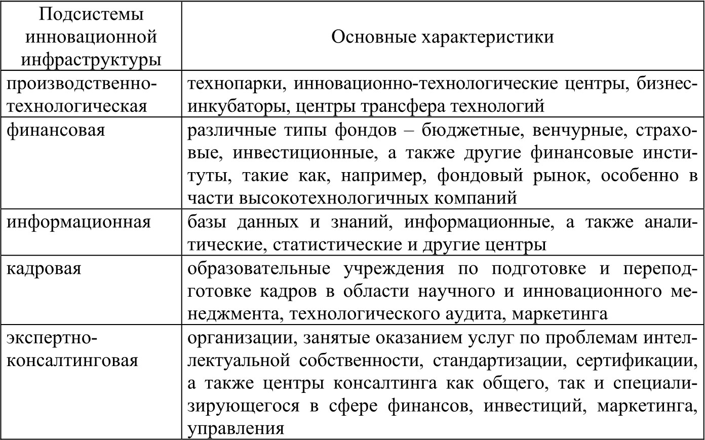 Характеристика подсистем инновационной инфраструктуры