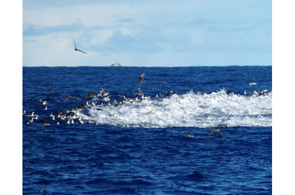 На свет повылазила куча всякой живности. Сначала закипела вода на большом пространстве, было видно, как там мечется рыба, над кипящей водой стаей кружились буревестники. Потом пришли махи-махи, такие же, как та, что мы поймали. Две пары. Они плыли рядом с лодкой и разглядывали нас, а мы их. Они даже сходили и посмотрели на наши крючки, волочащиеся за кормой. Но в этом районе уже все рыбы, наверное, знают про русскую яхту, которая тащит сзади фальшивую еду, так что они презрительно помахали хвостами, попрыгали возле наживки и ушли. Потом под бортом всплыла черепаха, мы ошалело проводили ее глазами. Потом проходящая мимо стайка дельфинов завернула на огонек, но долго не задержалась, прошли по своим делам. Два раза мимо проходил пароход, он ходит вокруг кругами, то ли рыбу разведывает, то ли еще что…