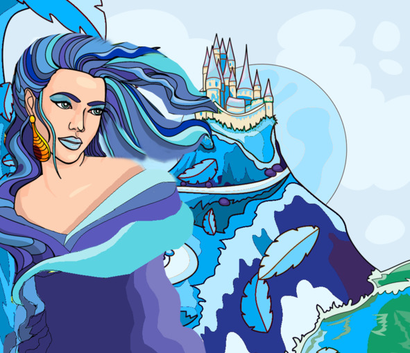 А в самих санях, сидела молодая красавица. У неё ровная, белоснежная кожа, сравнима со снегом вокруг. Длинные волосы, белее снега, а на голове, тиара из ледяных кристаллов.