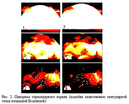 Далее вихревые образования будущих галактик разрывали на многочисленные осколки первородную энергию. Эти осколки давали возможность продолжению реакциям синтеза. Только после них сформировались атомные ядра, а затем и лёгкие атомы водорода и гелия, способные формировать звёзды и их скопления. При этом первородная энергия в запертом состоянии сохраняла все иерархические зародыши для производства нового вещества Вселенной до настоящего времени. Мы полагаем, что термоядерные реакции синтеза не могут протекать без подвода дополнительной энергии.