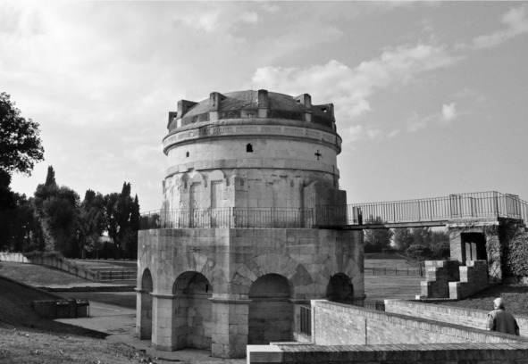 А вот в своем мавзолее, который он начал строить на закате жизни, Теодорих не стал использовать мозаики и христианские символы. Получилось мощное и грубое здание круглой формы, типа крепостной башни, сразу наводящее мысли на варварское происхождение того, кто это здание задумал. Может, он и хотел оставить такое впечатление? Ведь всю жизнь Теодориха задевало нежелание римской аристократии признать его равным себе, их нескрываемое пренебрежение. Свой среди чужих, чужой среди своих…