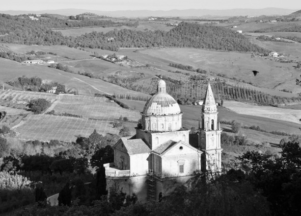 В последний день, встав до рассвета и захватив фотокамеру, отправился ловить уникальные кадры. Ранний автобус за минуту домчал меня до подножия города, где стоял храм Мадонна Сан-Бьяджо, построенный Антонио Сангалло в 1511 году для Козимо Медичи. Теплого охристого цвета, ладный, совершенных пропорций, он высился на фоне зеленеющих долин, виноградников, дорог. Я заглянул в приоткрытую дверь – в храме шел ремонт, лениво бродили сонные работяги.