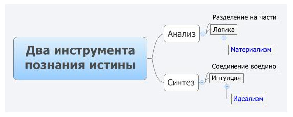 Первый метод (анализ) заключается в том, чтобы разделить некую идею на составляющие части и путём размышлений, рассуждений и раздумий над каждой из них с помощью логики прийти к пониманию истины.