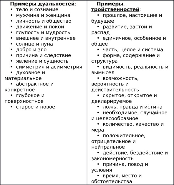 Все основные философские категории объединяются в дуальности (две взаимосвязанные противоположности) и тройственности.
