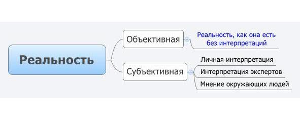 Реальность такой, какая она есть в действительности, без собственных интерпретаций и оценок, мы не воспринимаем. Всё, что мы видим, слышим и ощущаем, мы вольно или невольно интерпретируем, навешивая ярлыки в виде слов, словосочетаний, оценок, определений и мнений. Поэтому любой реальный материальный объект может быть: